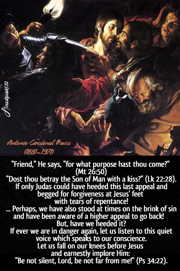 “Ingratitude is a very cruel thing. It imprints a deep wound on the human heart and the heart of Jesus, was infinitely more sensitive than ours. He had raised Judas to the high rank of the Apostolate; He had made him one of His closest friends and had entrusted him with the secrets of His infinite love. Now Judas betrays Him for the wretched sum of thirty pieces of silver. Worse is to follow, however. While Jesus is praying and perspiring blood at the thought of the ingratitude of men and of the nearness of His passion and death, the Garden of Gethsemane becomes suddenly aglow with torches and reverberates with the shouting of the hired ruffians, whom Judas has brought with him to arrest Jesus. The treacherous Apostle comes forward. He embraces our divine Redeemer, hails Him as his Master and greets Him with a sacrilegious kiss upon the cheek. Jesus neither repulses nor rebukes him but, with a gesture of infinite mercy, He addresses him as a friend. “Friend,” He says, “for what purpose hast thou come?” (Mt 26:50). “Dost thou betray the Son of Man with a kiss?” (Lk 22:28). If only Judas could have heeded this last appeal and begged for forgiveness at Jesus’ feet with tears of repentance! Jesus would certainly have taken him to His heart and returned his kiss with a kiss of pardon and divine friendship. Perhaps, we have also stood at times on the brink of sin and have been aware of a higher appeal to go back! But, have we heeded it? If ever we are in danger again, let us listen to this quiet voice which speaks to our conscience. Let us fall on our knees before Jesus and earnestly implore Him: “Be not silent, Lord, be not far from me!” (Ps 34:22). Let us ask Him to have pity on our weakness and to come to our assistance.”