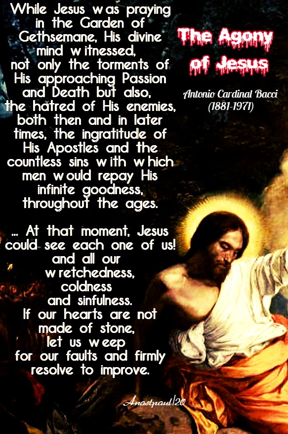 “While Jesus was praying in the Garden of Gethsemane, His divine mind witnessed, not only the torments of His approaching Passion and Death but also, the hatred of His enemies, both then and in later times, the ingratitude of His Apostles and the countless sins with which men would repay His infinite goodness, throughout the ages. He realised, that He would be a sign of contradiction for many. Some would hate Him, others would desecrate His Precious Blood and His Immaculate Body. Many, forgetful of the Redemption, would commit sin after sin, while others would receive special graces and would return only coldness and indifference in exchange for such great love. Faced with this gloomy scene, Jesus was utterly dejected and was overcome by a mysterious rending agony, which caused Him to perspire blood. “He began to feel dread and to be exceedingly troubled” (Mk 14:33). “And falling into an agony, he prayed the more earnestly. And his sweat became as drops of blood running down upon the ground” (lk 22:43-44). At that moment, Jesus could see each one of us! and all our wretchedness, coldness and sinfulness. If our hearts are not made of stone, let us weep for our faults and firmly resolve to improve.”