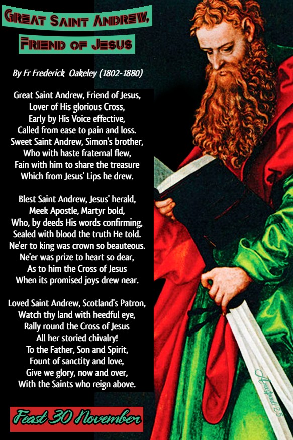 Great Saint Andrew, Friend of Jesus, Lover of His glorious Cross, Early by His Voice effective, Called from ease to pain and loss. Sweet Saint Andrew, Simon’s brother, Who with haste fraternal flew, Fain with him to share the treasure Which from Jesus’ Lips he drew.