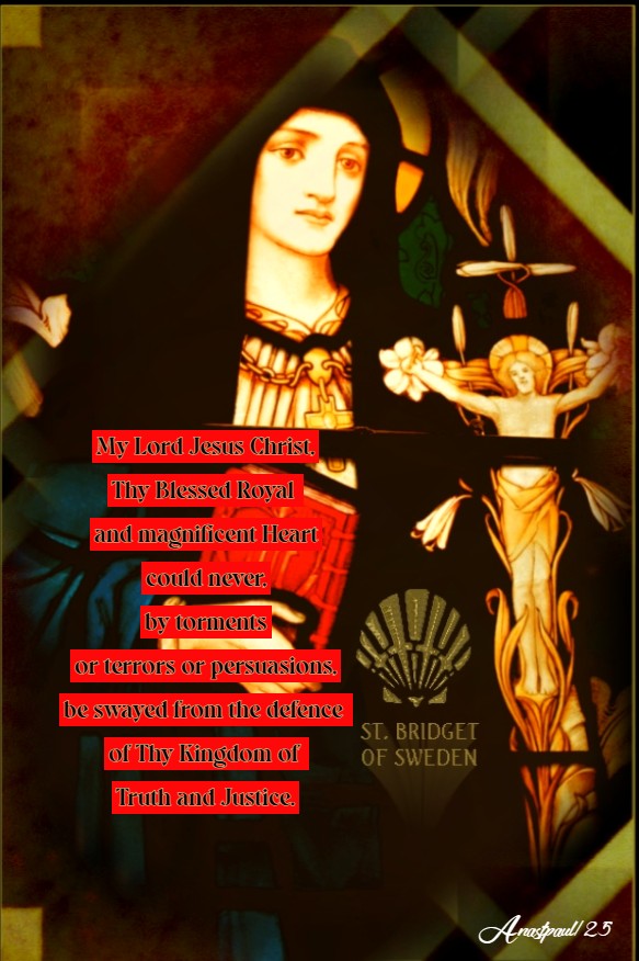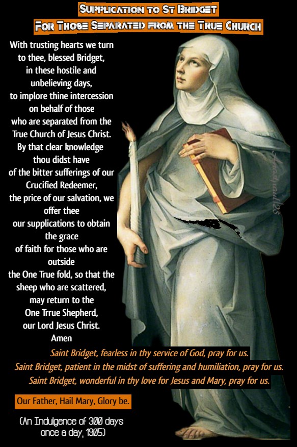 With trusting hearts we turn to thee, blessed Bridget, in these hostile and unbelieving days, to implore thine intercession on behalf of those who are separated from the True Church of Jesus Christ. By that clear knowledge thou didst have of the bitter sufferings of our Crucified Redeemer, the price of our salvation, we offer thee our supplications to obtain the grace of faith for those who are outside the One True fold, so that the sheep who are scattered, may return to the One Trrue Shepherd, our Lord Jesus Christ. Amen