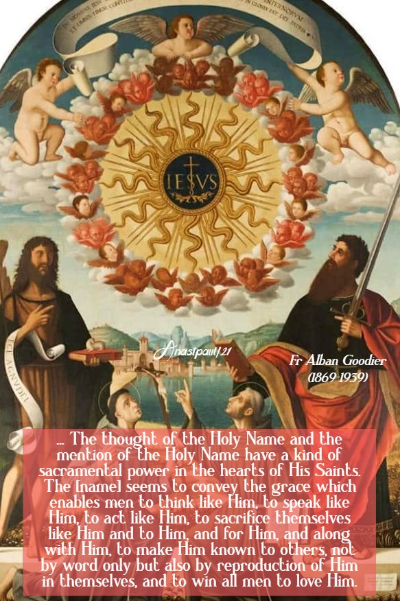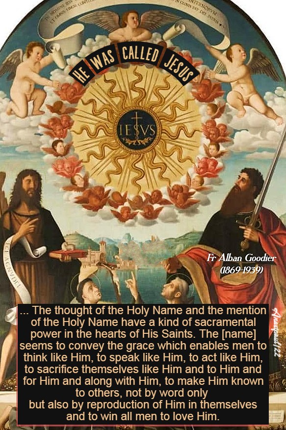 But He is also to them the Mirror of all the most glorious and winning virtues. He is, and His Name tells them that He is, unbounded Charity, infinite Mercy, extremest Kindness, deepest Humility, most devoted Piety, transparent Simplicity, uttermost Poverty, Chastity without a stain. It is the prerogative of love to transform those who love into the likeness of Him Whom they love and as the mere name of one who is loved cannot sound in the ear or be thought of in the mind, without adding to the love which is already there, so the thought of the Holy Name and the mention of the Holy Name have a kind of sacramental power in the hearts of His Saints. The [name] seems to convey the grace which enables men to think like Him, to speak like Him, to act like Him, to sacrifice themselves like Him and to Him and for Him and along with Him, to make Him known to others, not by word only but also by reproduction of Him in themselves and to win all men to love Him.” – Fr Alban Goodier SJ (1869-1939) Archbishop – Excerpted from The Prince of Peace.