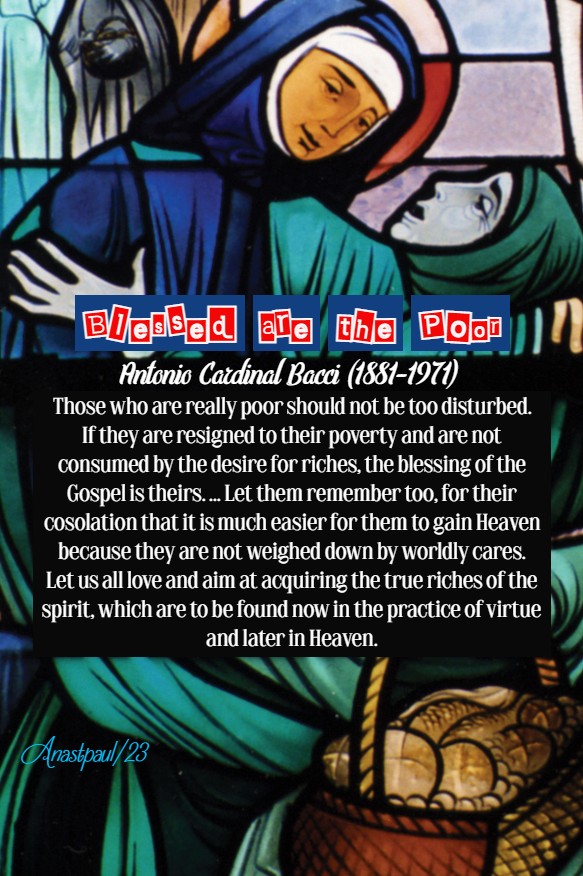 “Those who are really poor should not be too disturbed. If they are resigned to their poverty and are not consumed by the desire for riches, the blessing of the Gospel is theirs. Let them remember that when Jesus became Man, in order to redeem us, He did not choose to be wealthy. He chose to be the poorest of men. Similarly, Our Blessed Lady, St Joseph and all the Saints, were free from all desire of worldly possessions, so that there was room in their hearts only for God, their supreme good. Let them remember too, for their cosolation that it is much easier for them to gain Heaven because they are not weighed down by worldly cares.