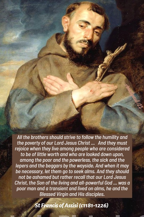 All the brothers should strive to follow the humility and the poverty of our Lord Jesus Christ … And they must rejoice when they live among people who are considered to be of little worth and who are looked down upon, among the poor and the powerless, the sick and the lepers and the beggars by the wayside. And when it may be necessary, let them go to seek alms. And they should not be ashamed but rather recall that our Lord Jesus Christ, the Son of the living and all-powerful God … was a poor man and a transient and lived on alms, he and the Blessed Virgin and His disciples.” – St Francis of Assisi (c1181-1226) Founder of the Friars Minor (Earlier Rule, #8-9).