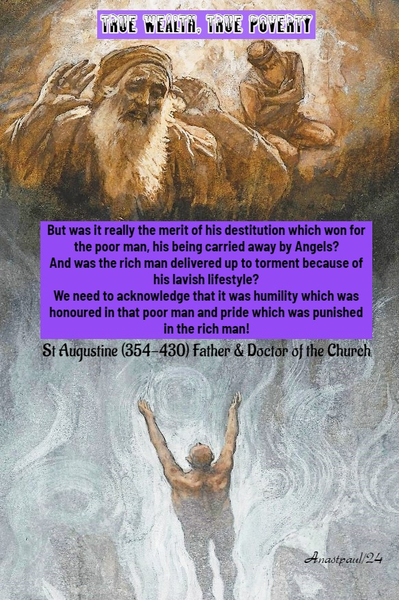 But was it really the merit of his destitution which won for the poor man, his being carried away by Angels? And was the rich man delivered up to torment because of his lavish lifestyle? We need to acknowledge that it was humility which was honoured in that poor man and pride which was punished in the rich man!” – St Augustine (354-430) Father & Doctor of the Church(Discourses on the Psalms 85,3).