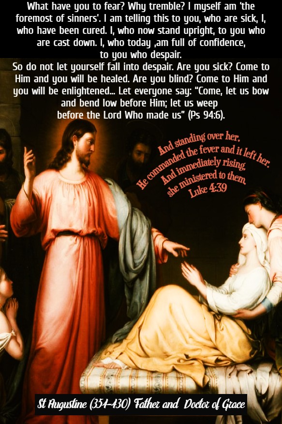 So do not let yourself fall into despair. Are you sick? Come to Him and you will be healed. Are you blind? Come to Him and you will be enlightened… Let everyone say: “Come, let us bow and bend low before Him; let us weep before the Lord Who made us” (Ps 94:6).” – St Augustine (354-430) Bishop of Hippo, Father and Doctor of Grace (Sermon 176, 4).