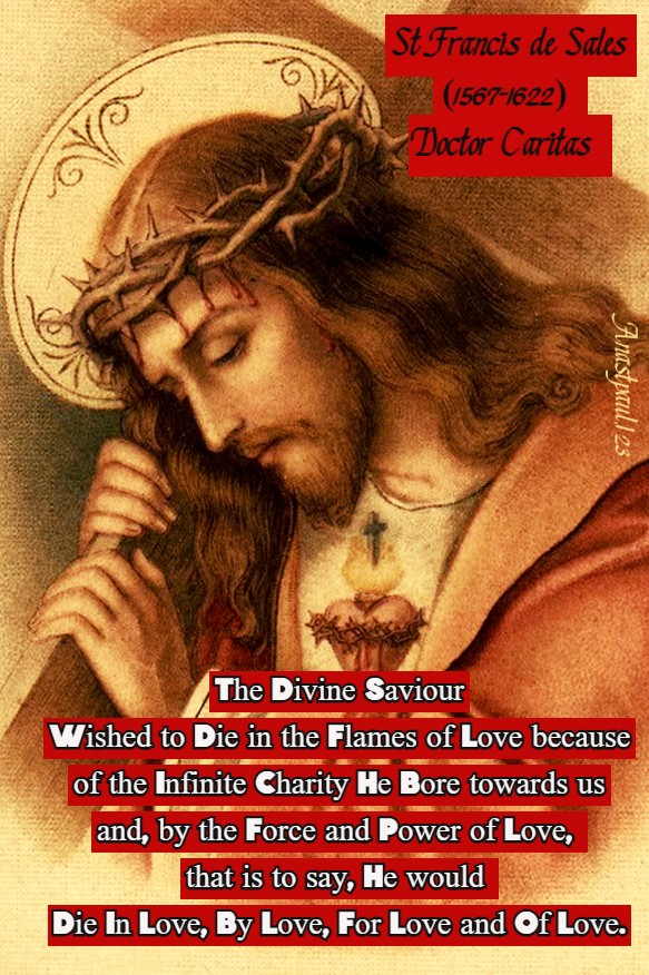 The Divine Saviour wished to die in the flames of love because of the Infinite Charity He bore towards us and, by the force and power of love, that is to say, He would die in love, by love, for love and of love. This is what He Himself says: “No-one takes away My life but I lay it down of Myself, for I have power to lay it down and to take it up again” .—He was offered, says Isaias because He wished it.” – (Consoling Thoughts of St Francis de Sales).