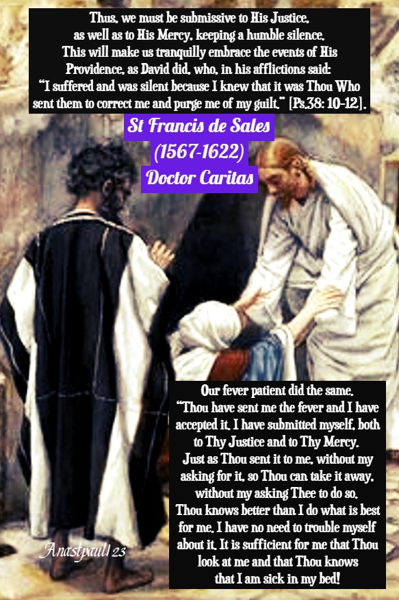Our fever patient did the same. “Thou have sent me the fever and I have accepted it. I have submitted myself, both to Thy Justice and to Thy Mercy. Just as Thou sent it to me, without my asking for it, so Thou can take it away, without my asking Thee to do so. Thou knows better than I do what is best for me. I have no need to trouble myself about it. It is sufficient for me that Thou look at me and that Thou knows that I am sick in my bed!” – (Sermon for the Thursday after the Third Sunday of Lent, 3 March 1622, concerning the cure of St Peter’s mother-in-law).