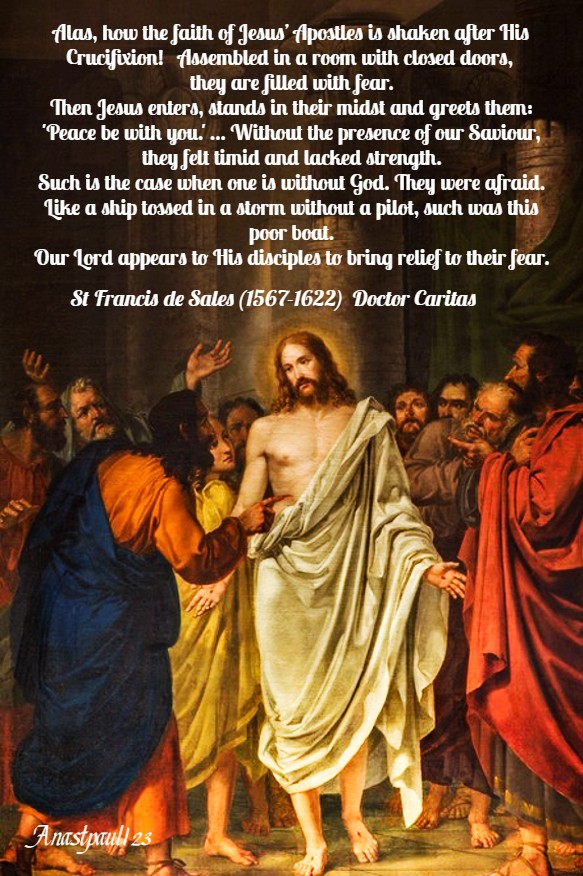 “Alas, how the faith of Jesus’ Apostles is shaken after His Crucifixion! Assembled in a room with closed doors, they are filled with fear. Then Jesus enters, stands in their midst and greets them: ‘Peace be with you.’ Showing them the signs and marks of the reconciliation of humanity with God, He says, ‘See My Hands and My Side.’ Why does He do this? To bolster their vacillating faith. Without the presence of our Saviour, they felt timid and lacked strength. Such is the case when one is without God. They were afraid. Like a ship tossed in a storm without a pilot, such was this poor boat. Our Lord appears to His disciples to bring relief to their fear.” – (Sermon of St Francis de Sales for Lent).