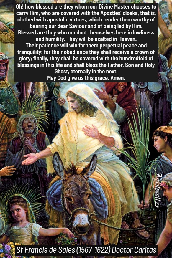 Oh! how blessed are they whom our Divine Master chooses to carry Him, who are covered with the Apostles’ cloaks, that is, clothed with apostolic virtues, which render them worthy of bearing our dear Saviour and of being led by Him. Blessed are they who conduct themselves here in lowliness and humility. They will be exalted in Heaven [Matt. 18:4; 23:12; Lk. 14:11; 18:14]. Their patience will win for them perpetual peace and tranquility; for their obedience they shall receive a crown of glory [Tab. 3:21; James 1:12]; finally, they shall be covered with the hundredfold of blessings in this life and shall bless the Father, Son and Holy Ghost, eternally in the next. May God give us this grace. Amen.” – (Spiritual Conferences, XVII – St Francis de Sales).