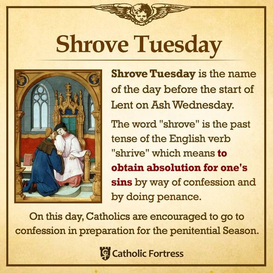 Shrove Tuesday: Shrove is the past tense of the word Shrive, which means “to hear a confession, assign penance and absolve from sin.” In the Middle Ages, especially in Northern Europe and England, it became the custom to confess one’s sins on the day before Lent began in order to enter the penitential season in a repentant spirit.