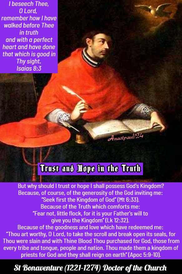 But why should I trust or hope I shall possess God’s Kingdom? Because, of course, of the generosity of the God inviting me: “Seek first the Kingdom of God” (Mt 6:33). Because of the Truth which comforts me: “Fear not, little flock, for it is your Father’s will to give you the Kingdom” (Lk 12:32). Because of the goodness and love which have redeemed me: “Thou art worthy, O Lord, to take the scroll and break open its seals, for Thou were slain and with Thine Blood Thou purchased for God, those from every tribe and tongue, people and nation. Thou made them a kingdom of priests for God and they shall reign on earth“ (Apoc 5:9-10).” (On the Kingdom of the Gospel)