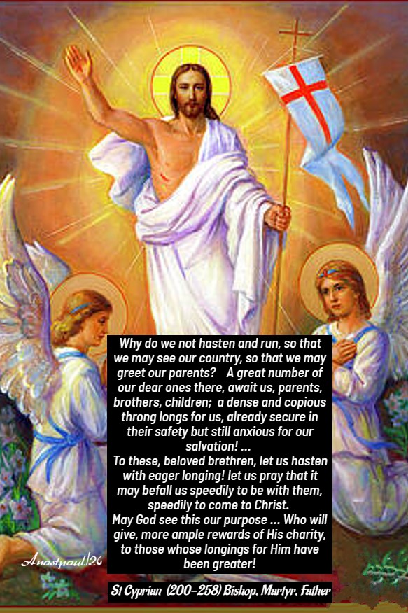 To these, beloved brethren, let us hasten with eager longing! let us pray that it may befall us speedily to be with them, speedily to come to Christ. May God see this our purpose … Who will give, more ample rewards of His charity, to those whose longings for Him have been greater.” – St Cyprian (200-258) Bishop of Carthage, Martyr, Father (On Mortality 26).