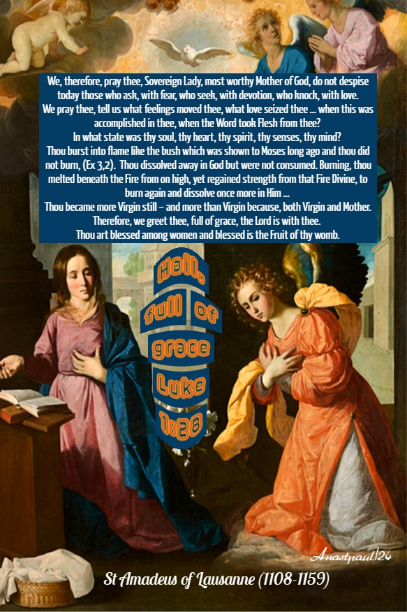 We, therefore, pray thee, Sovereign Lady, most worthy Mother of God, do not despise today those who ask, with fear, who seek, with devotion, who knock, with love. We pray thee, tell us what feelings moved thee, what love seized thee … when this was accomplished in thee, when the Word took Flesh from thee? In what state was thy soul, thy heart, thy spirit, thy senses, thy mind? Thou burst into flame like the bush which was shown to Moses long ago and thou did not burn, (Ex 3:2). Thou dissolved away in God but were not consumed. Burning, thou melted beneath the Fire from on high, yet regained strength from that Fire Divine, to burn again and dissolve once more in Him … Thou became more Virgin still – and more than Virgin because, both Virgin and Mother. Therefore, we greet thee, full of grace, the Lord is with thee. Thou art blessed among women and blessed is the Fruit of thy womb.” – St Amadeus of Lausanne (1108-1159) Cistercian Bishop of Lausanne (Marian Sermons).