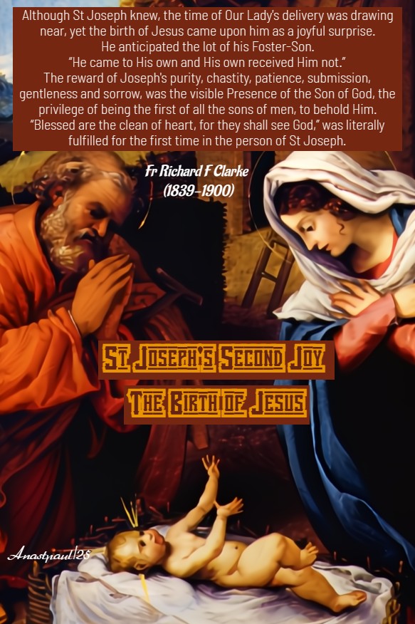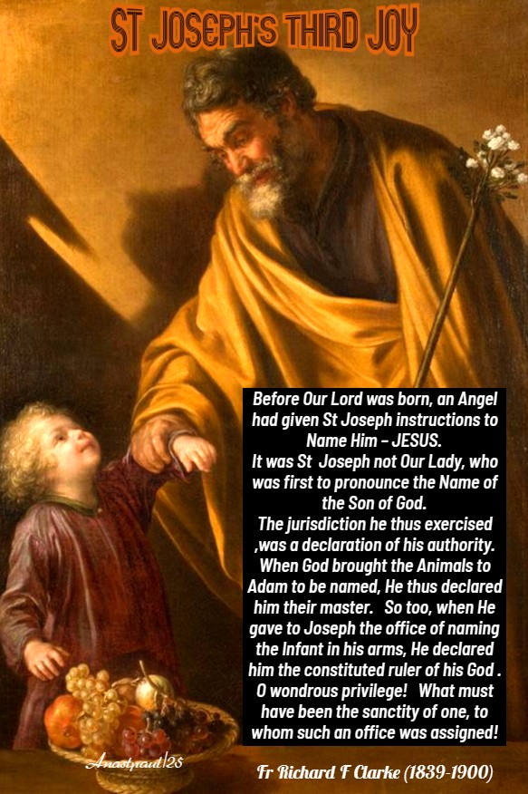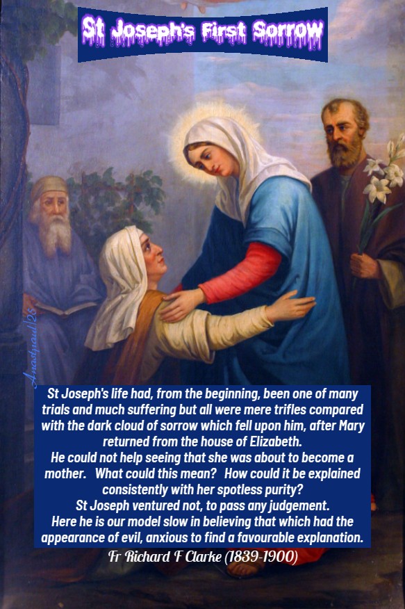 so to St Joseph, in the Angel’s message. He was to be our guardian and protector. He was to keep us safe on the dangerous journey of life! he was to console us and care for us in darkness and sorrow, while we wait in this land of exile for the summons to our true home. Joseph, too, is to bring us safely into the promised land at last.