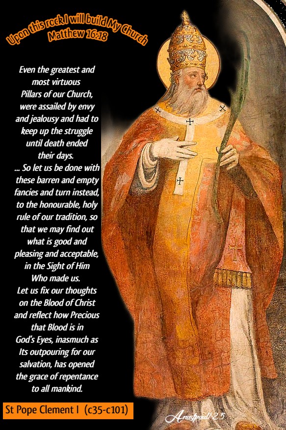 Now, all this is not being written as a warning to you alone, my dear friends but, for a reminder to ourselves too because, we also, are in the same arena and have the same conflict before ourselves. So let us be done with these barren and empty fancies and turn instead, to the honourable, holy rule of our tradition, so that we may find out what is good and pleasing and acceptable, in the Sight of Him Who made us. Let us fix our thoughts on the Blood of Christ and reflect how precious that Blood is in God’s Eyes, inasmuch as Its outpouring for our salvation, has opened the grace of repentance to all mankind.” – St Pope Clement I (c35-c101) – Pope from c88 to 101, Father (Letter to the Corinthians 5-7).