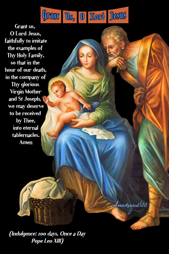 Grant us, O Lord Jesus, faithfully to imitate the examples of Thy Holy Family, so that in the hour of our death, in the company of Thy glorious Virgin Mother and St Joseph, we may deserve to be received by Thee, into eternal tablernacles. Amen
