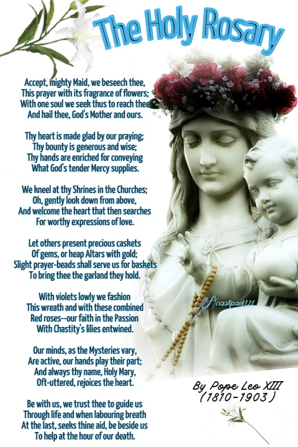 Our minds, as the Mysteries vary, Are active, our hands play their part And always thy name, Holy Mary! Oft-uttered, rejoices the heart.