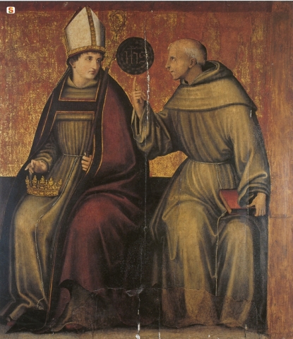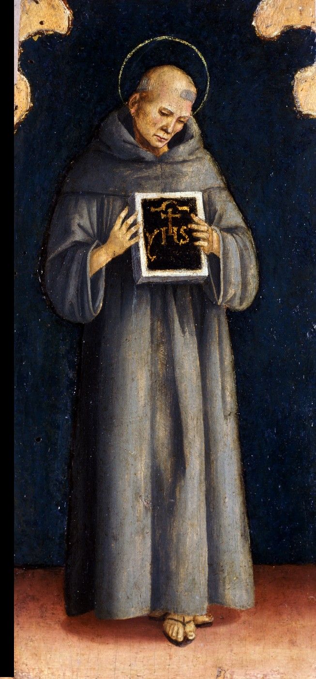Bernadine was assigned to preaching, having a natural gift given by the Holy Spirit. Over the next decade of his life, he traveled throughout Italy, preaching in major cities, a natural successor to Saint Vincent Ferrer. The Adorable Name of Jesus was the usual theme of his sermons, stemming from his aunt’s instruction as a child. Wherever he traveled, he carried a tablet on which the Holy Name of Jesus (IHS) was written, adopting it as his standard and his “sole weapon.” He firmly held only in this Name could man be saved, as Saint Peter had instructed the elders in the Synagogue.