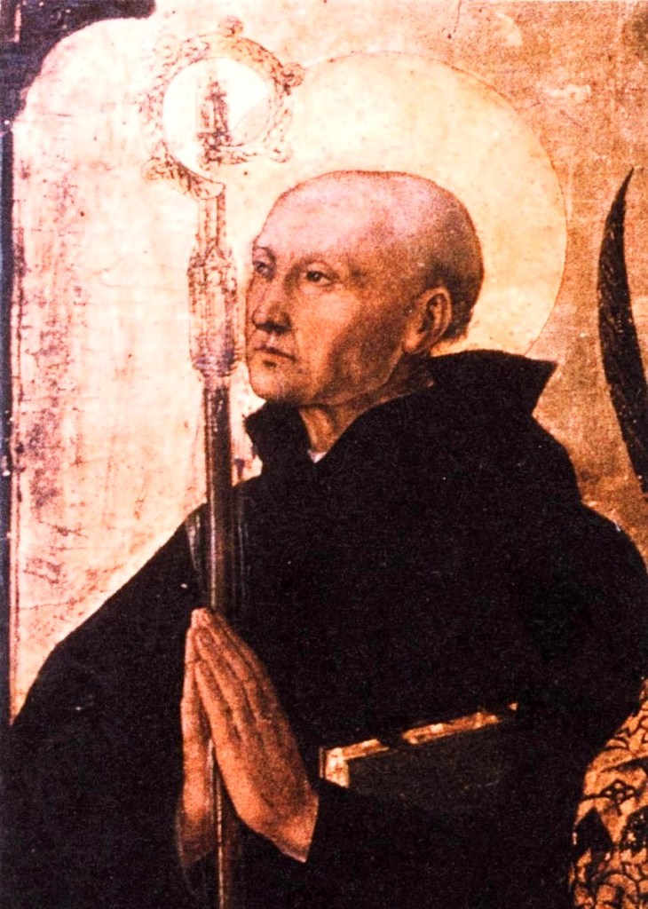 He died in his monastic cell at Favianae while singing Psalm 150. Six years after his death, his Monks were driven from their Abbey and his body was taken to Italy, where it was at first kept in the Castel dell’Ovo, Naples, then eventually interred at the Benedictine Monastery rededicated to him, the Abbey of San Severino in the City of Naples.