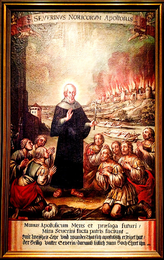 Severinus was a high-born Roman living as an Hermit in the East. He was an ascetic in practice. He is first recorded as travelling along the Danube in Noricum and Bavaria, preaching Christianity, procuring supplies for the starving, redeeming captives and establishing Monasteries at Passau and Favianae,