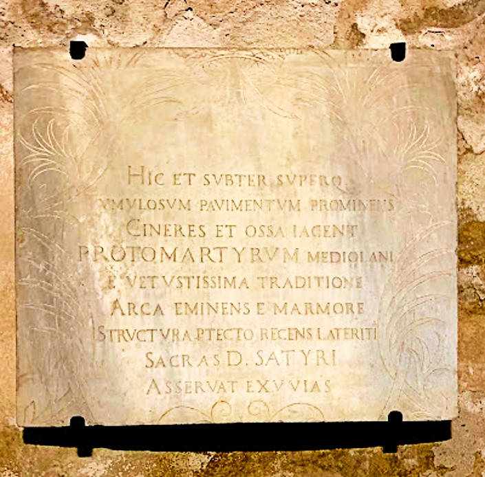 An inscription which notes the site as the place of his burial, alongside several early Martyrs of the Church of Milan.