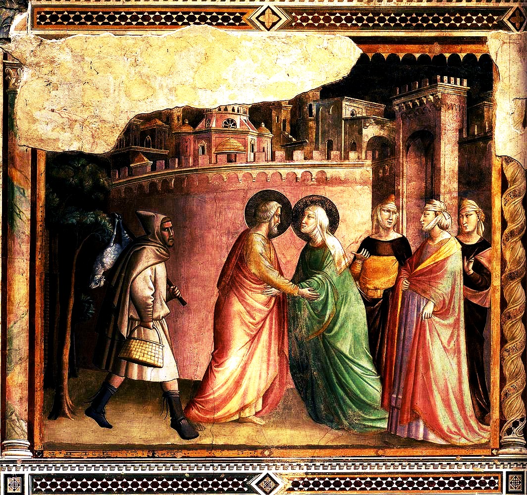 Joachim returned to Jerusalem and embraced Anne at the City gate, located in the Walls of Jerusalem. An ancient belief held that a child born of an elderly mother who had given up hope of having offspring was destined for great things. It is also tradition that Joachim would give Mary to the service of the Temple when the girl was only three years old.