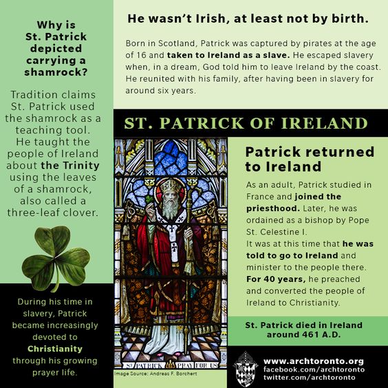 Although we think of Ireland when we remember St Patrick, he wasn not born in Ireland. He was born probably in Scotland but sources differ on this point – he might have been born in England or in France. His father was a Deacon and his grandfather had been a Priest.
