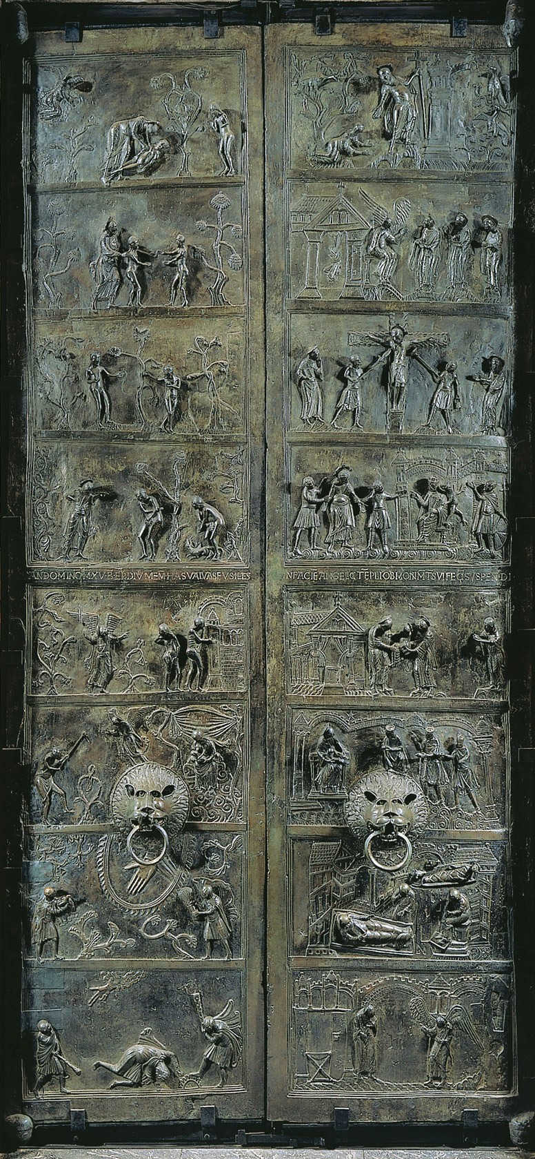 One of the most famous examples of Bernward’s work ,is a monumental set of cast bronze doors, known as the Bernward Doors, now installed at St. Mary’s Cathedral. The Doors are sculpted with scenes of the Fall of Man and the Salvation of Man – Life of Christ and which are related, in some ways to the wooden doors of Santa Sabina in Rome.