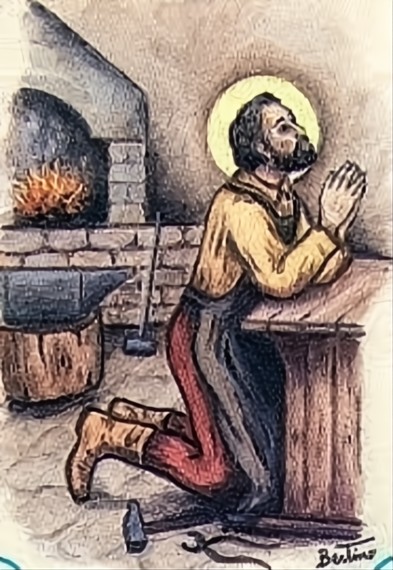 These are the Representations of this our little-known but o so holy and worthy Saint: • anvil • Bishop with a Crosier in his right hand, on the open palm of his left a miniature Church of chased gold • Bishop with a hammer, anvil and horseshoe • Bishop with a horse • Courtier • Goldsmith • hammer • horseshoe • man grasping a devil’s nose with pincers • man holding a Chalice and Goldsmith’s hammer • man holding a horse’s leg, which he detached from the horse in order to shoe it more easily • man shoeing a horse • man with hammer and crown near a smithy • man with hammer, anvil and Saint Anthony • pincers • man with Saint Godebertha of Noyon • man giving a ring to Saint Godebertha • man working as a Goldsmith. (catholicsaintsinfo.mobi).