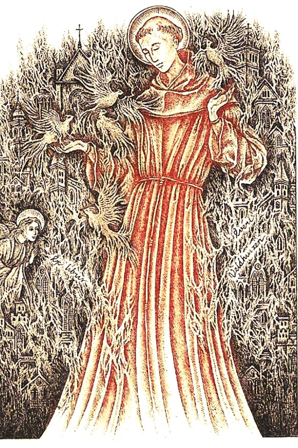 Born Giovanni di Pietro di Bernardone ( informally called Francesco by his Mother) – (1181 at Assisi, Umbria, Italy – 4 October 1226 at Portiuncula, Italy of natural causes). His relics are enshrined in the Basilica built and named for him in Assisi, Italy. St Francis was Canonised on 16 July 1228 by Pope Gregory IX. Patronages – • against dying alone• against fire• animal welfare societies• animals• birds• ecologists, ecology• environment, environmentalism, environmentalists• families• lace makers, lace workers• merchants• needle workers• peace• tapestry workers• zoos• Italy• Colorado• Catholic Action• Franciscan Order• 10 dioceses• 10 cities. Attributes – • apparition of Jesus• Christ child• birds• deer• fish• lamb• skull• stigmata• wolf. In 1224 he received the stigmata during the apparition of Seraphic angels in a religious ecstasy making him the first recorded person in Christian history to bear the wounds of Christ’s Passion. He died during the evening hours of 3 October 1226, while listening to a reading he had requested of Psalm 142 (141). Francis is one of the most venerated religious figures in history.