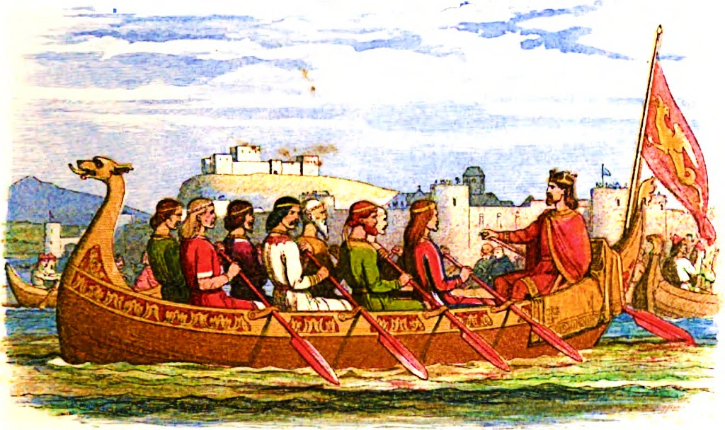 Malcolm greeting Margaret at her arrival in Scotland – detail of a mural by Victorian artist William Hole