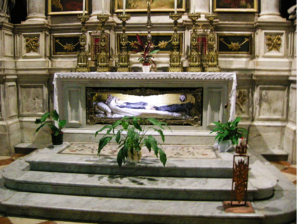 On 9 May 1608, she was Canonised by Pope Paul V and in the following decades a diligent search was made for her remains, which had been hidden due to the troubled times in which she lived. Her body was found incorrupt some months after her death. Her grave was identified on 2 April 1638, (but this time only the bones remained) and her remains were reburied in the Church of Santa Maria Nova on 9 March 1649, which since then has been her feast day. Again, in 1869, her body was exhumed and has since then been displayed in a glass coffin for the veneration of the faithful. The Church of Santa Maria Nova is now usually referred to as the Church of St Frances.