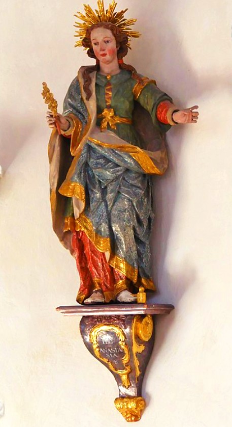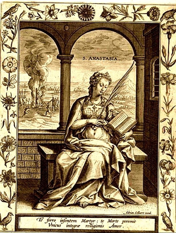 Anastasia, daughter of Pretestato a noble Roman, was a native of Sirmium, Pannonia, a Roman City in what is now Yugoslavia. She was the wife of Publius, a pagan, nevertheless, she was entirely devoted to assisting the Christians of Rome, who were forbidden, by an unjust law, to carry out any profession. Her husband, who was very much against her good works, cruelly punished her every disobedience but she was comforted by the advice of St Chrysogonus, who was also persecuted and imprisoned.
