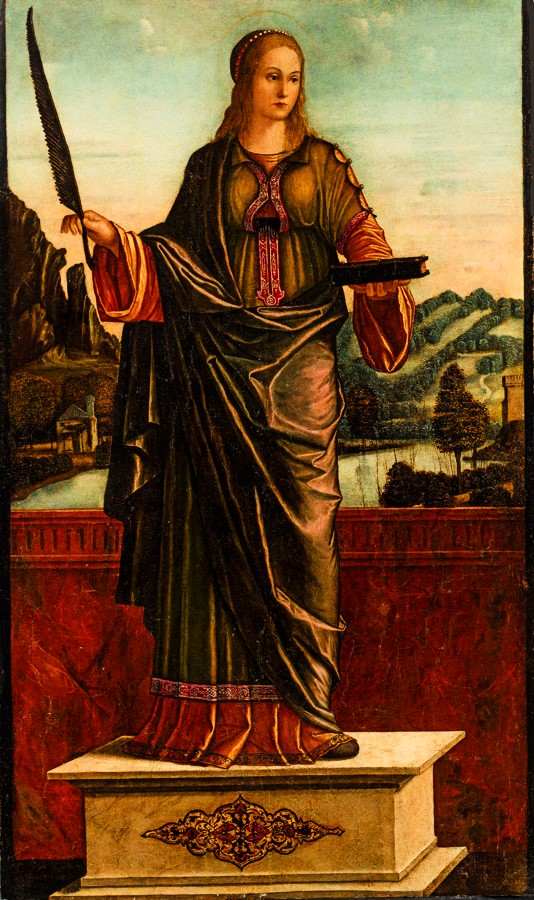 She is depicted without particular attributes among the virgins in procession in the Church of St Apollinare Nuovo, also present on the bronze door of St Mark in Venice, in the Cathedral of Zadar in Sirmium (Yugoslavia) and others. In ancient times various Churches were dedicated to her, including that of Verona and the other very ancient and important for its historical and archaeological aspect, in Rome, already mentioned which, in the 7th Century, was already listed as the third most important Church after the Lateran and St Mary Major. The Cathedral of Zadar (Sirmium) is also dedicated to her.