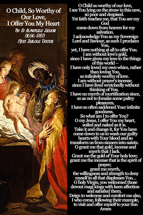 PRAYER – “Give me, therefore, I pray Thee, this gold, this incense and this myrrh. Give me the gold of Thy holy love, give me the spirit of holy prayer, give me the desire and strength to mortify myself in everything that displeases Thee. I am resolved to obey Thee and to love Thee but Thou knowest my weakness, oh, give me the grace to be faithful to Thee!” … St Alphonsus Liguori (1696-1787) Doctor of the Church