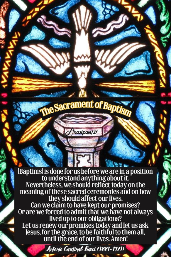 All this is done for us before we are in a position to understand anything about it. Nevertheless, we should reflect today on the meaning of these sacred ceremonies and on how they should affect our lives. Can we claim to have kept our promises? Or are we forced to admit that we have not always lived up to our obligations? Let us renew our promises today and let us ask Jesus, for the grace, to be faithful to them all, until the end of our lives. Amen!