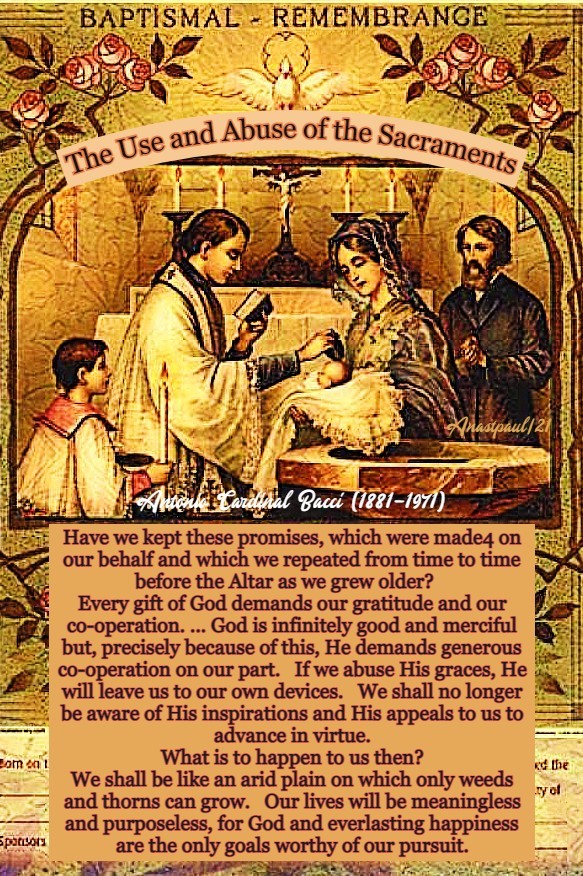 Have we kept these promises, which were made4 on our behalf and which we repeated from time to time before the Altar as we grew older? Every gift of God demands our gratitude and our co-operation. It is our own grave loss, if we remain cold and indifferent, in spite of the precious favours which we received from God. God is infinitely good and merciful but, precisely because of this, He demands generous co-operation on our part. If we abuse His graces, He will leave us to our own devices. We shall no longer be aware of His inspirations and His appeals to us to advance in virtue. What is to happen to us then? We shall be like an arid plain on which only weeds and thorns can grow. Our lives will be meaningless and purposeless, for God and everlasting happiness are the only goals worthy of our pursuit.”