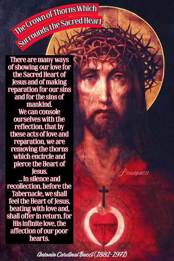 “There are many ways of showing our love for the Sacred Heart of Jesus and of making reparation for our sins and for the sins of mankind. We can console ourselves with the reflection, that by these acts of love and reparation, we are removing the thorns which encircle and pierce the Heart of Jesus. The simplest ways of doing this, are by prayers, aspirations and expressions of love, directed towards the adorable Heart of our Redeemer and, by visits to Jesus in the Blessed Sacrament. In silence and recollection, before the Tabernacle, we shall feel the Heart of Jesus, beating with love and, shall offer in return, for His infinite love, the affection of our poor hearts.