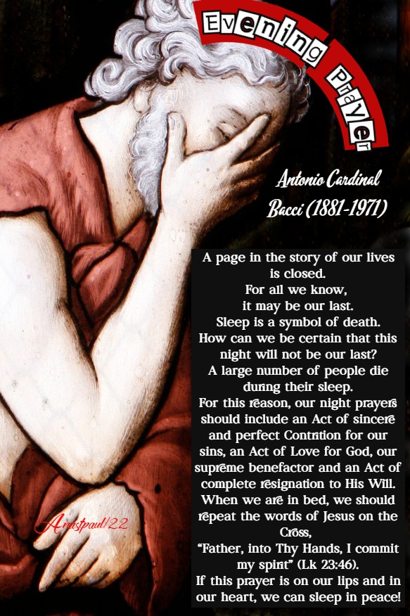 When we are in bed, we should repeat the words of Jesus on the Cross, “Father, into Thy Hands, I commit my spirit” (Lk 23:46). If this prayer is on our lips and in our heart, we can sleep in peace.”