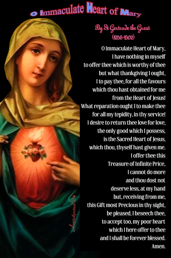 O Immaculate Heart of Mary, I have nothing in myself to offer thee which is worthy of thee but what thanksgiving I ought I to pay thee, for all the favours which thou hast obtained for me from the Heart of Jesus! What reparation ought I to make thee for all my tepidity, in thy service! I desire to return thee love for love, the only good which I possess, is the Sacred Heart of Jesus, which thou, thyself hast given me. I offer thee this Treasure of Infinite Price, I cannot do more and thou dost not deserve less, at my hand but, receiving from me, this Gift most Precious in thy sight, be pleased, I beseech thee, to accept too, my poor heart which I here offer to thee and I shall be forever blessed. Amen.