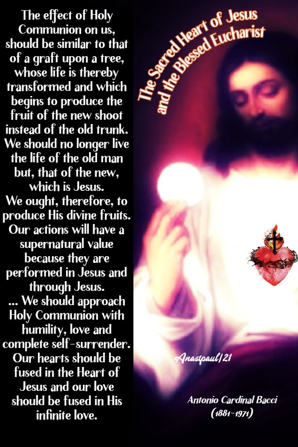 The effect of Holy Communion on us, should be similar to that of a graft upon a tree, whose life is thereby transformed and which begins to produce the fruit of the new shoot instead of the old trunk. We should no longer live the life of the old man but, that of the new, which is Jesus. We ought, therefore, to produce His divine fruits. Our actions will have a supernatural value because they are performed in Jesus and through Jesus. We should be very grateful to the Sacred Heart of Jesus for this gift of His infinite love and goodness. We should approach Holy Communion with humility, love and complete self-surrender. Our hearts should be fused in the Heart of Jesus and our love should be fused in His infinite love.”