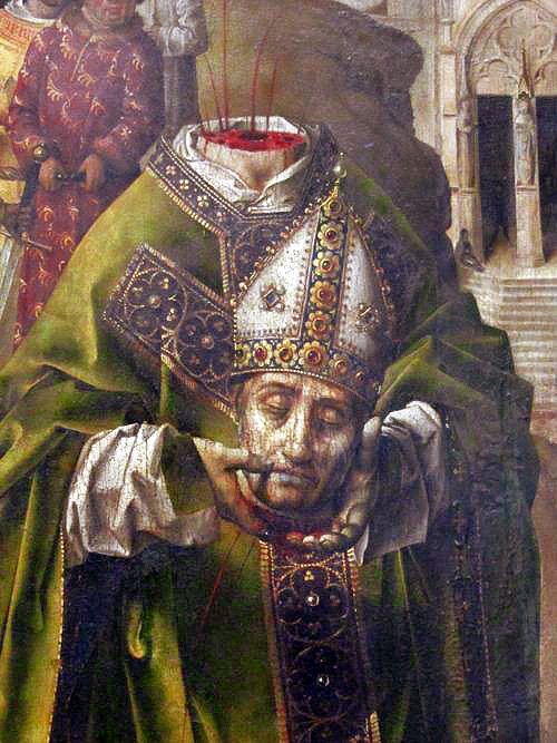 After he was decapitated, Denis picked his head up and walked several miles from the summit of the hill, preaching a sermon on repentance the entire way, making him the most renowned cephalophores in hagiology. Of the many accounts of this Martyrdom, this is noted in detail in the Golden Legend and in Butler’s Lives Of The Saints.