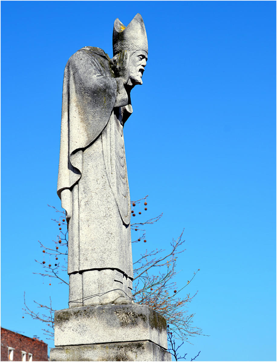 Josef Henselmann 1986: St Simpert with wolf and child (left), Bishop St Ulrich von Augsburg fighting the Hungarians (middle) and St Afra (right). The Group Statue composition stands at the fountain in front of the St Simbert’s Cathedral in Augsburg