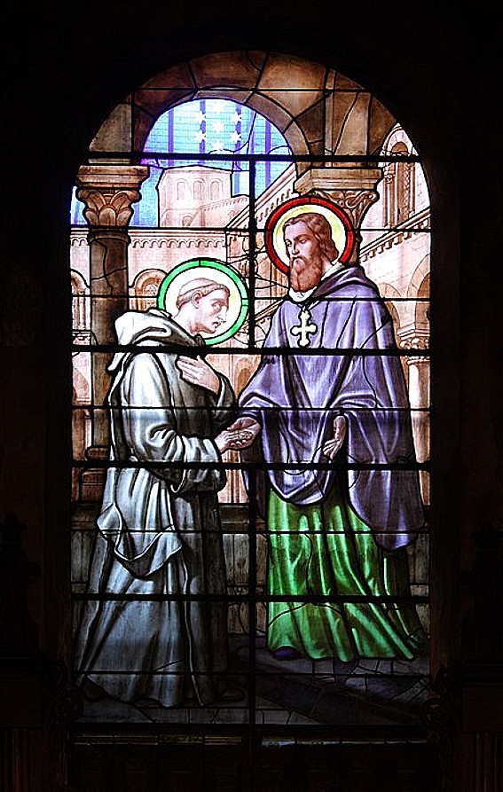 St Hugh (right) on a stained glass window in Grenoble Cathedral, St Bruno is on the left.