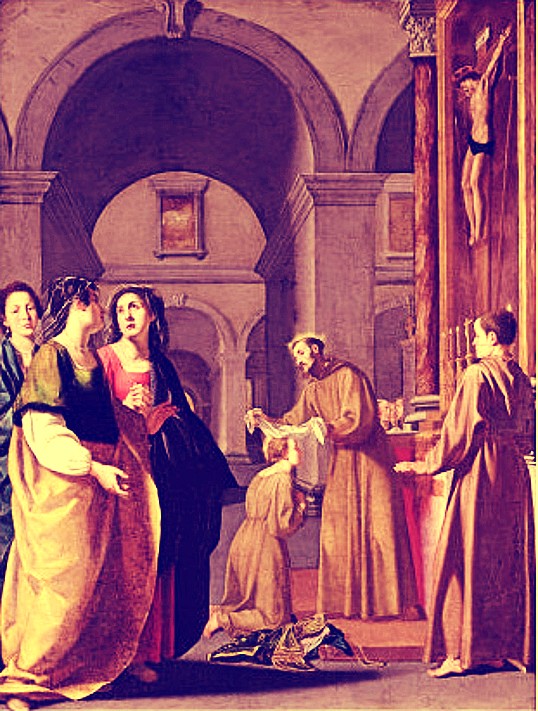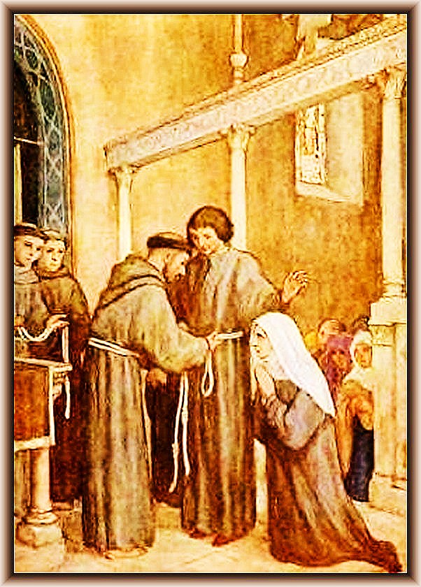 During this same period lived St Francis, surnamed “the Seraphic,” on account of his great virtues. Clare frequently went to him and confided to him, her desire to renounce the world and to consecrate her virginity to God and to lead a perfect life in the most abject poverty. St Francis who saw that besides other gifts and graces, she was filled with the most ardent love of God, possessing great innocence of heart and despising the world, strengthened her in her holy desire, while at the same time, he tested her constancy. Being sufficiently convinced that her desires were inspired by Heaven, he advised Clare to leave her home, which she did on Palm Sunday, going to the Church of the Portiuncula, where she had her hair cut off, as a sign that she would enter a religious life. She divested herself of all feminine ornament, and attired in a penitential garb, tied around her with a cord, she was placed. by St Francis in a vacant Benedictine Convent. She was at that time just eighteen years of age.