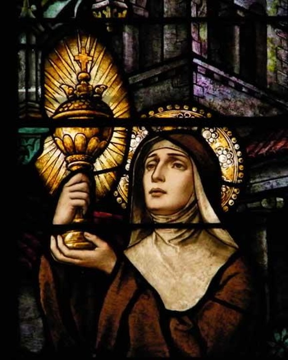 Saint of the Day – 12 August – St Clare of Assisi (1194-1253) Virgin. Patronages – embroiderers, needle workers, eyes, against eye disease, for good weather, gilders, gold workers, goldsmiths, laundry workers, television (proclaimed on 14 February 1958 by Pope Pius XII because when St Clare was too ill to attend the Holy Mass, she had been able to see and hear it, on the wall of her room.), television writers, Poor Clares, Assisi, Italy, Santa Clara Indian Pueblo.