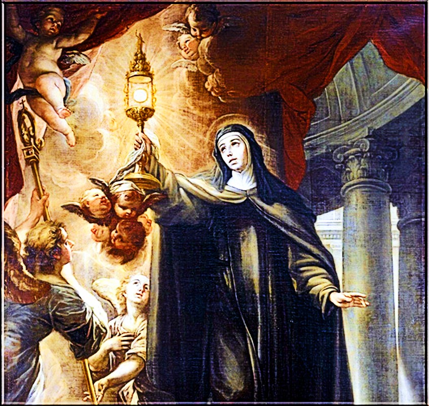 The Saracens besieged Assisi and made preparations to scale the walls of the Convent. St Clare, who was sick at the time, had herself carried to the gates of the Convent, where, with the Ciborium, containing the Blessed Sacrament, in her hands, prostrating herself in company with all her religious, she cried aloud: “O Lord, do not give into the hands of the infidels, the souls of those who acknowledge and praise Thee. Protect and preserve Thy handmaidens whom Thou hast redeemed with Thy Precious Blood.” A voice was distinctly heard, saying: “I will protect you always.”