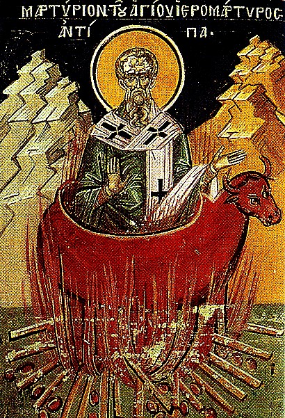 The Roman Martyrology states of St Antipas: “St Antipas, a faith witness, of whom St John speaks in the Apocalypse, under the Emperor Domitian, he was shut up n a red-hot brazen ox and thus, consummated his martyrdom.”