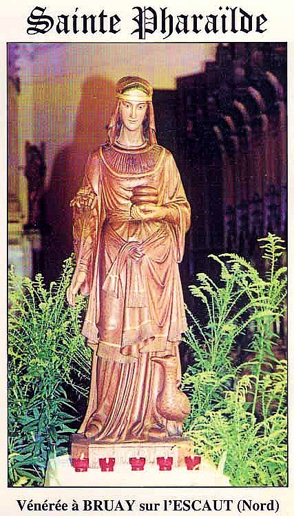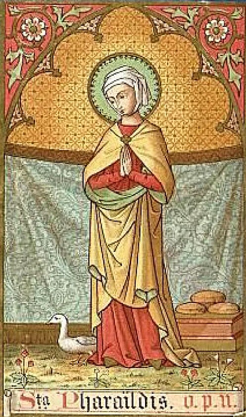 The Roman Martyrology states: ”In Bruay-sur-l’Escaut near Valencienne nell’Artois in Neustria, in modern-day ||Belgium, Saint Pharaildis, widow, who, forced to marry a violent man, is said to have embraced a life of prayer and austerity until old age.”