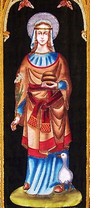 Once he had been given a live goose to take home and make dinner out of. Rigobert placed the bird in the arms of a servant who followed him. Along the way, while Rigobert was reciting the Office prayers, the bird tore itself free and flew away. The boy, grieved deeply over this accident but Rigobert comforted him and exhorted him to trust in God. When Rigobert resumed his prayers, the goose flew back to them. Thereafter, the Bishop kept the bird as a pet. The goose used to go with him to the Church, where it patiently waited outside while Rigobert celebrated Mass at an Altar dedicated to the Virgin Mary. – which Altar, he received in his exile after requesting it from the usurper bishop.